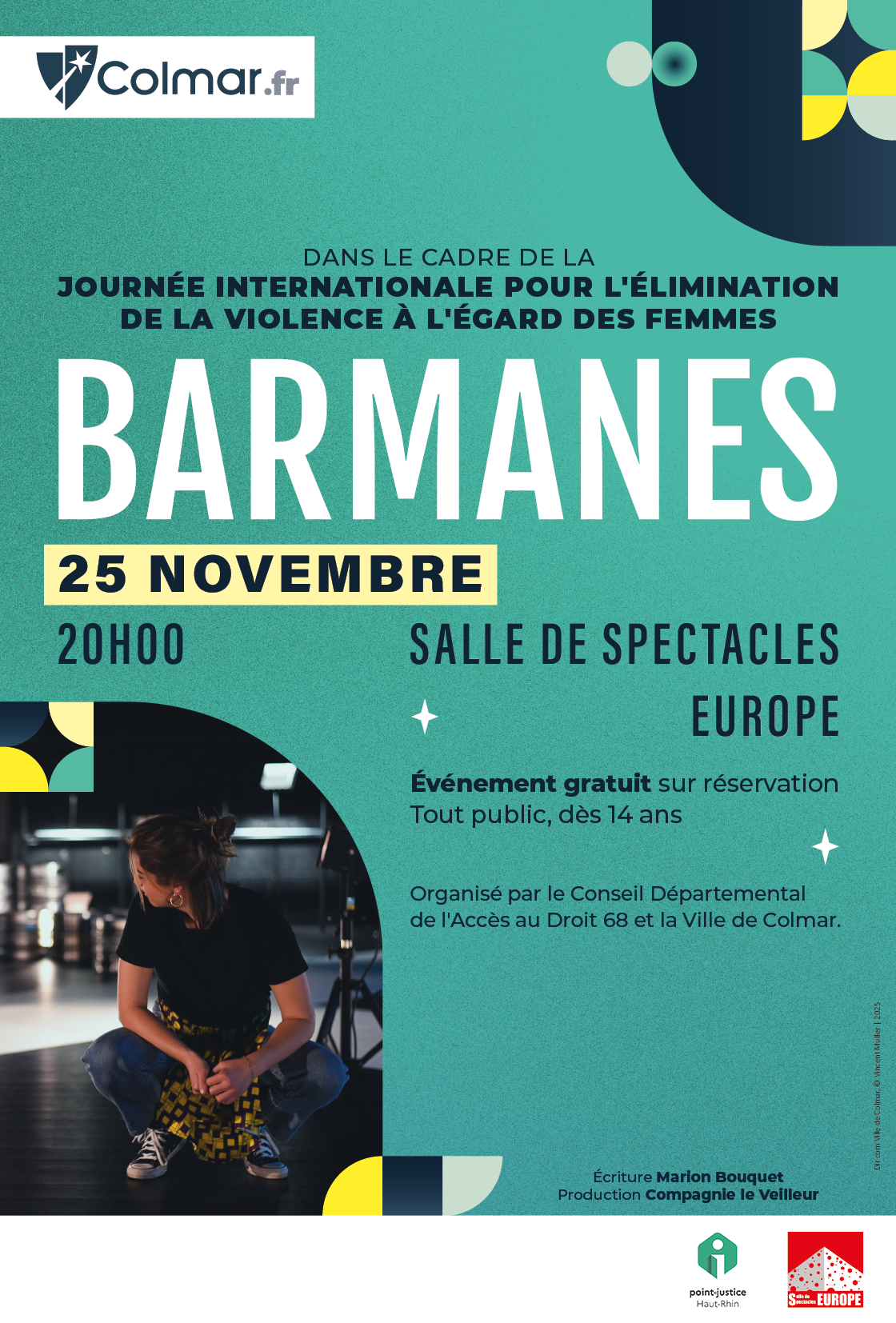À l’occasion de la Journée internationale pour l’élimination de la violence à l’égard des femmes, le mardi 25 novembre, la Ville de Colmar s’associe au Centre départemental de l’accès aux droits du Haut-Rhin (CDAD 68) pour proposer au public une pièce de théâtre gratuite, suivie d’un échange avec des professionnels, magistrats et spécialistes des violences faites aux femmes.