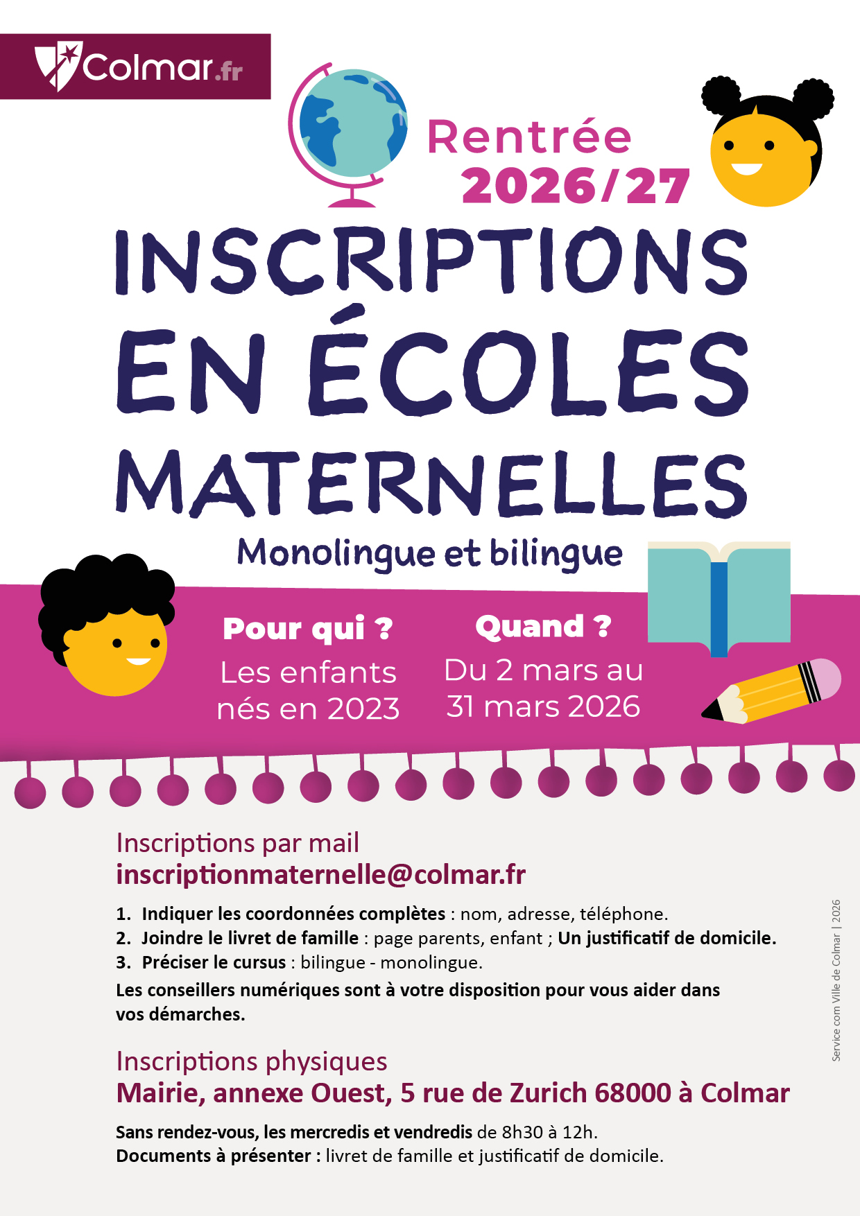 La campagne d’inscription dans les écoles maternelles de la Ville de Colmar pour la rentrée scolaire 2026/2027 se déroulera du lundi 2 mars au mardi 31 mars 2026. Cette inscription concerne les enfants nés en 2023.